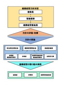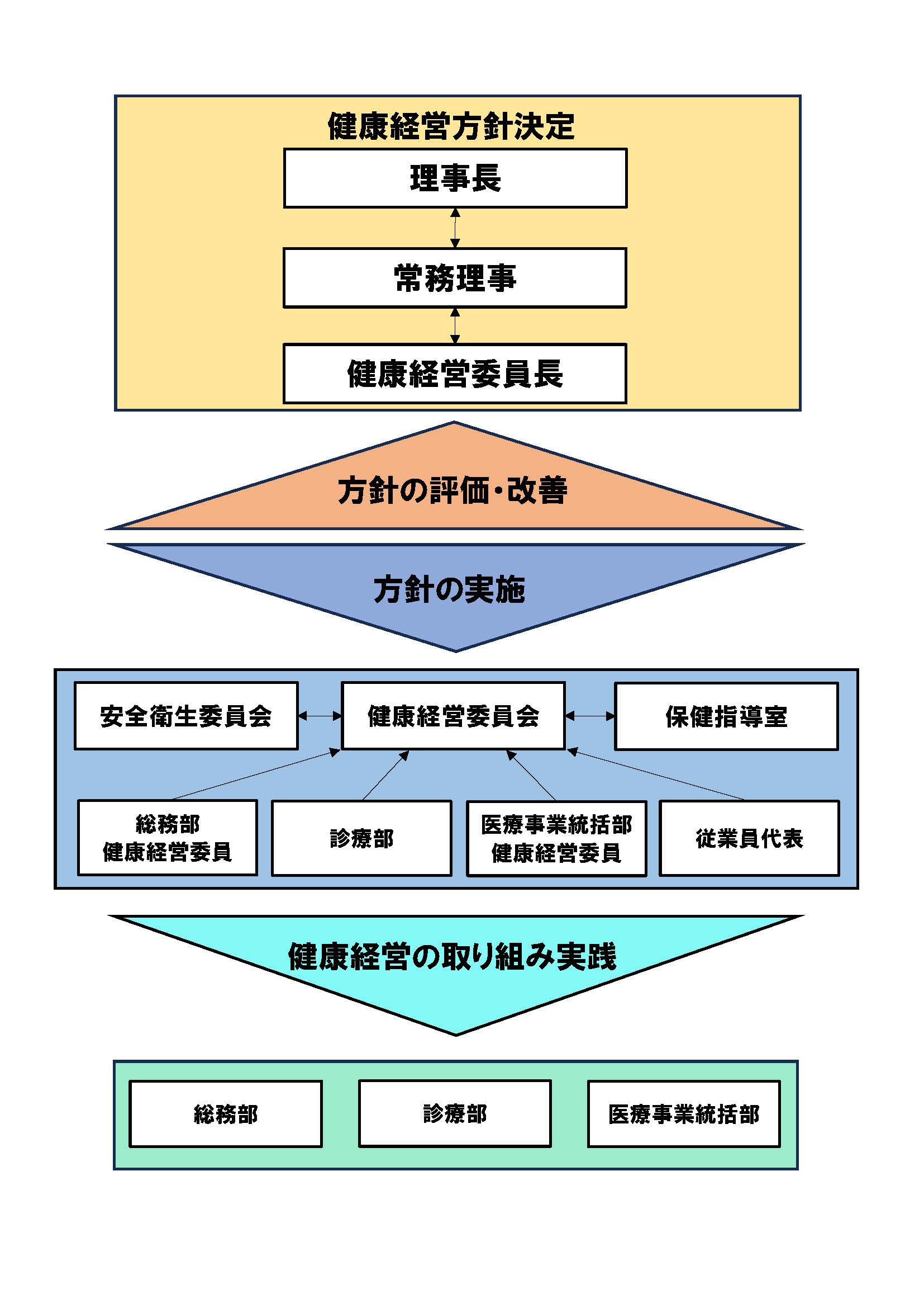 健康経営委員会は、各部署から健康経営委員が選抜され組織されています。健康経営委員会や安全衛生委員会、保健指導室が中心となり健康経営の推進方針の立案を行い、最終的には理事長や常務理事、健康経営委員長が推進方針の決定・実施指示を行っています。決定された方針に則り、健康経営委員会では保健指導室や安全衛生委員会と連携し、施策立案・進捗管理・効果検証を行い、理事長・常務理事に方針の評価・改善策等を報告しています。事業の取り組み関しては、健康経営委員が中心となり各自の部署で実践しています。
